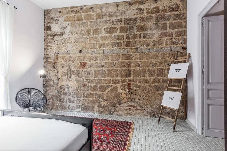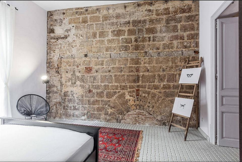 The decoration of this apartment displays of a style that is both modern and industrial, with brick veneer walls and a floor of small tiles, matched with a contemporary furniture. Its major assets lies in the beautiful patio, provided with a nice pool, which you can access from the living room, the latter including the kitchen featuring the latest equipments and a decoration of simple lines. The bedroom is large and pleasant and gets a lot of light from its large windows, overlooking the outside.