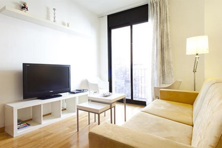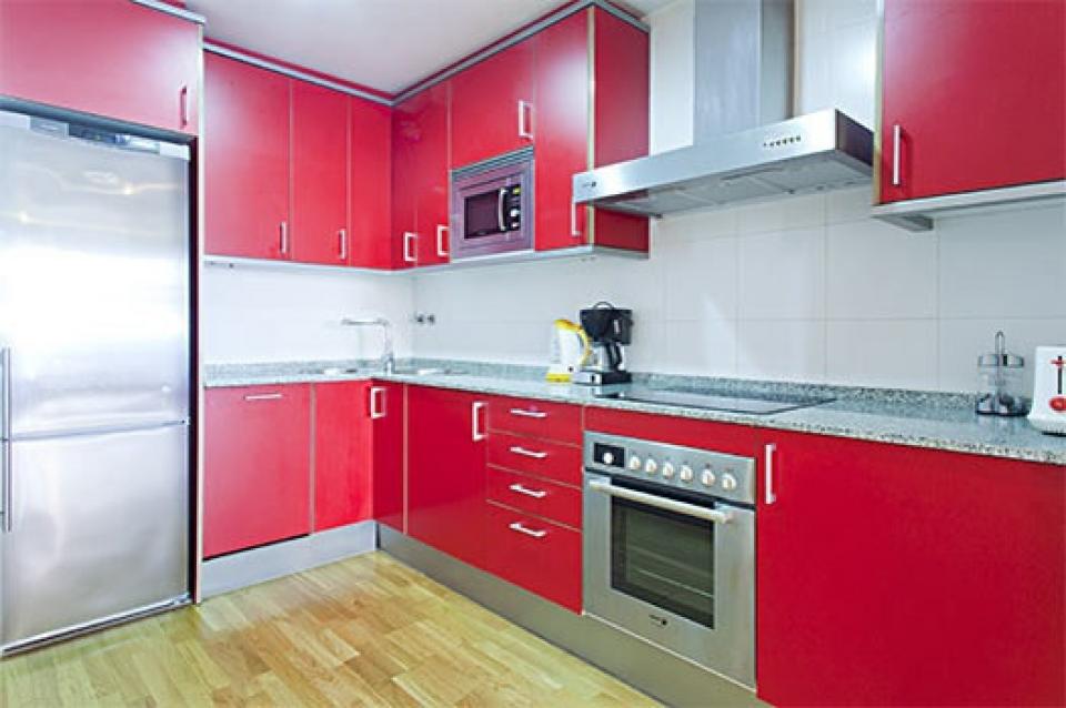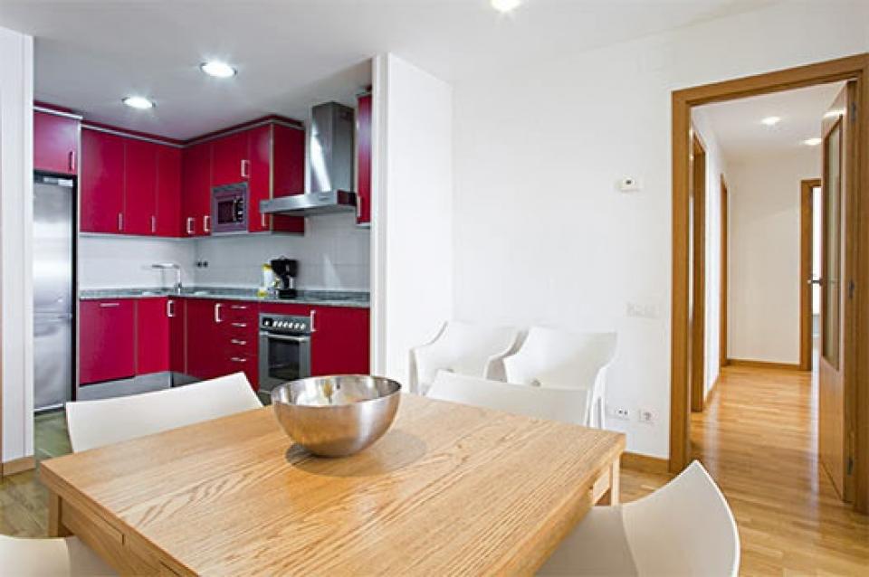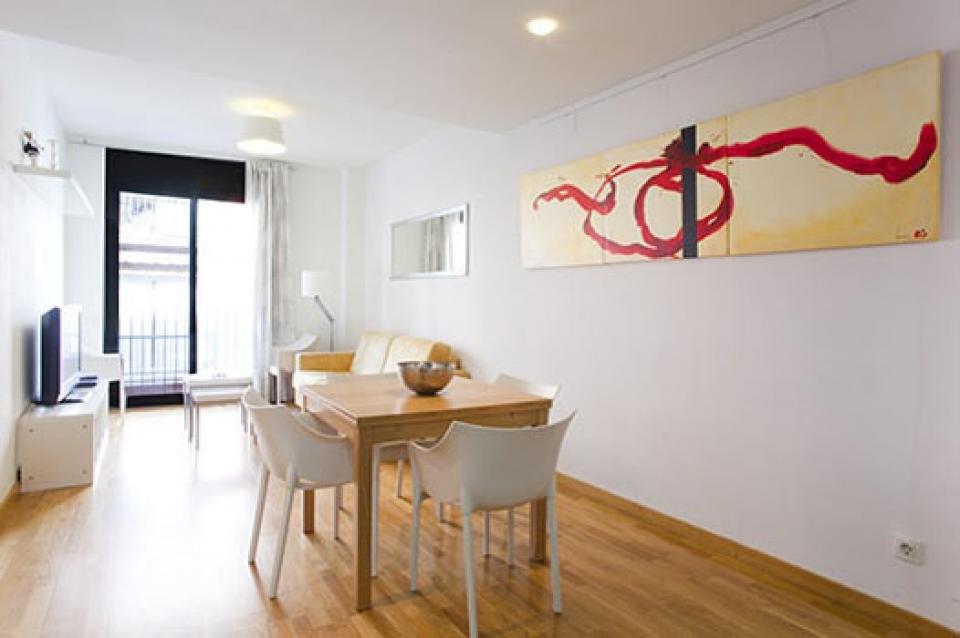 Rent Gracia apartment with terrace that comes with a spacious living area with a soft brown suede couch and flatscreen TV and access to a private balcony. The ruby-red and fully equipped kitchen opens to a relaxing dining space decorated with an abstract painting behind a wooden table for four. The bedrooms are minimally decorated but filled with natural light and furnished with comfortable beds. The building also comes with a furnished communal terrace, great for relaxing under the Mediterranean sunshine.