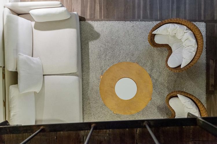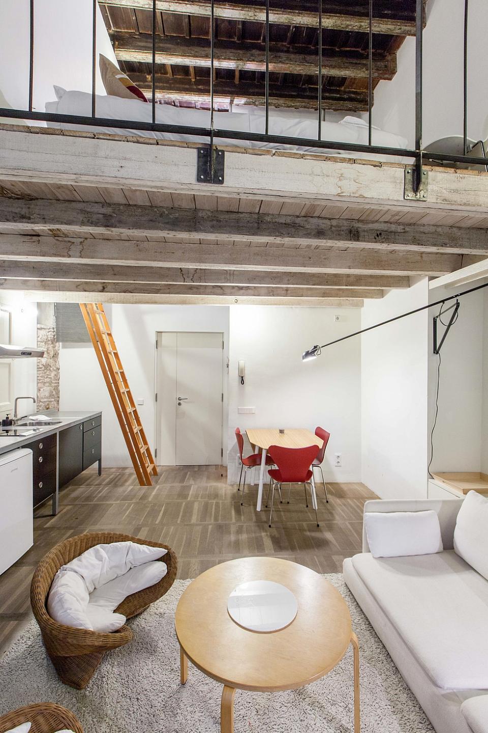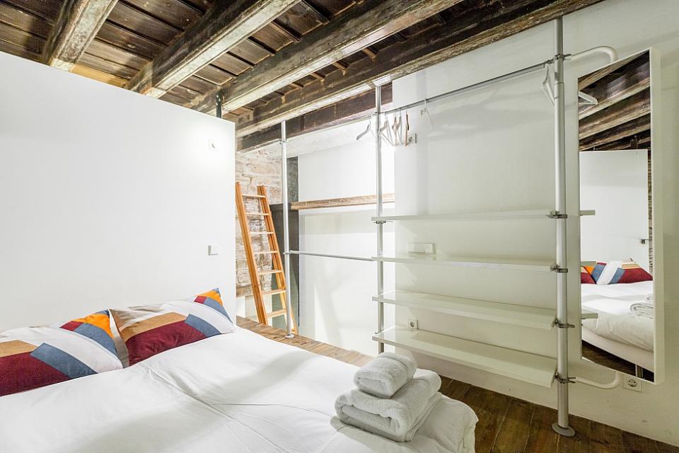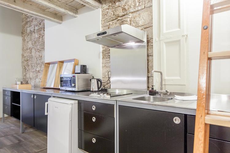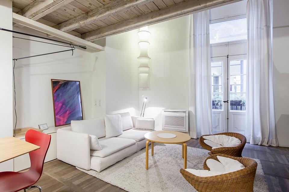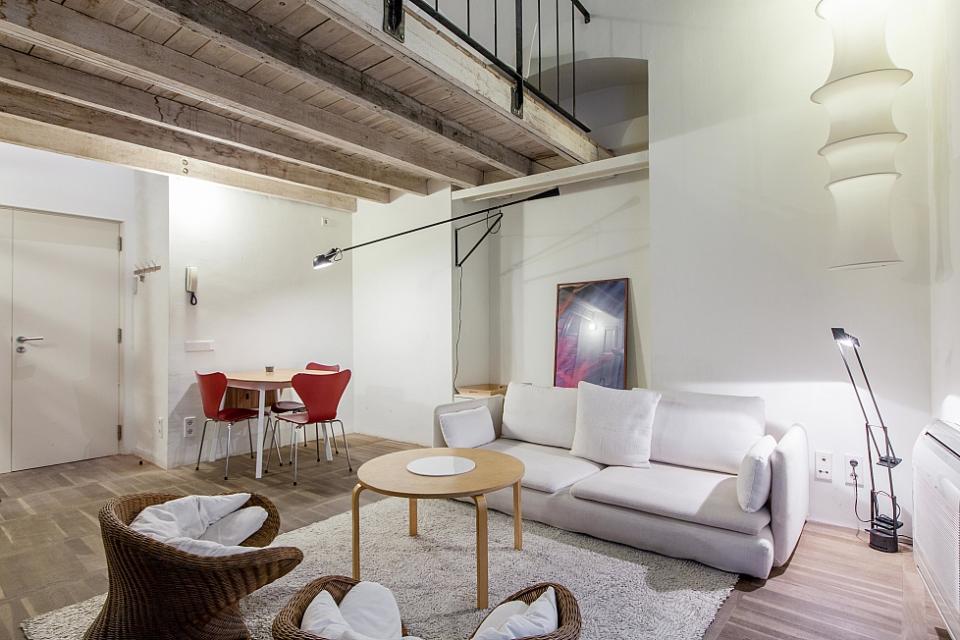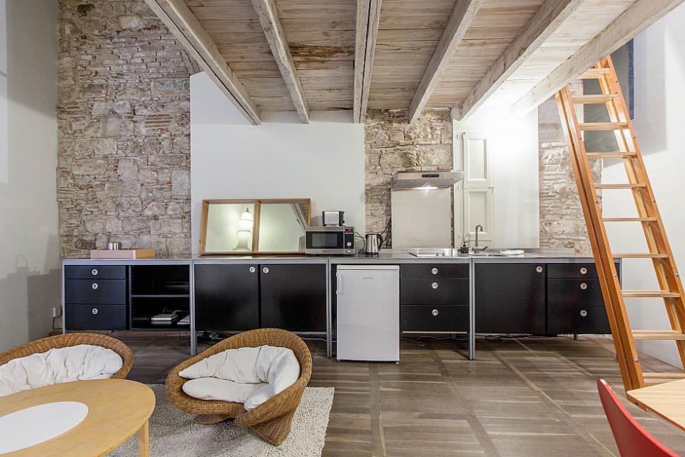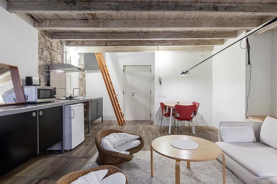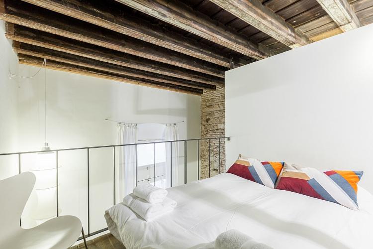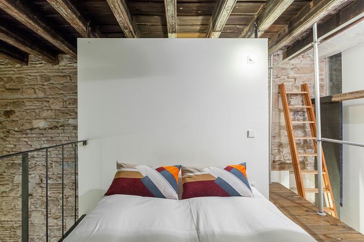 Situado en un edificio del siglo XV del barrio Gótico, este exquisito loft tiene lo necesario para una tranquila estancia en el centro. El interior combina contemporáneos elementos, como el mobiliario e iluminación, con originales características, como las dramáticas paredes de piedra y vigas de madera. La primera planta consta de un encantador salón con un esquema de blanco y beige iluminado por abundante luz desde el balcón, así como un sofá y una suave alfombra a través de lisos suelos de parquet. Frente a esto se encuentra una cocina americana y un espacio de comedor, también perfecto para trabajar. Una escalera de madera se extiende a la elevada zona de dormir, amueblada con una cama, estantería y un baño que recuerda a una acogedora masía rústica.