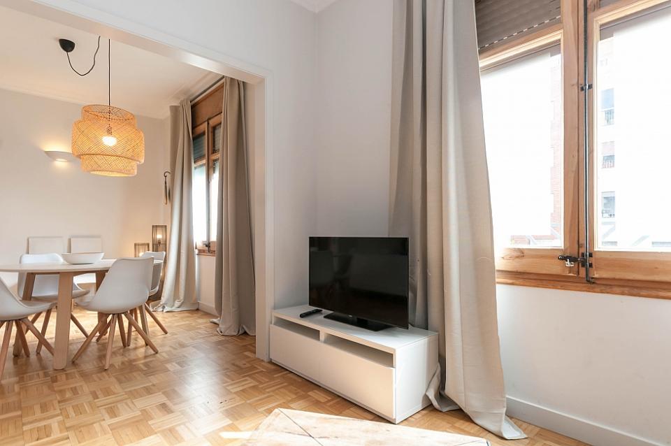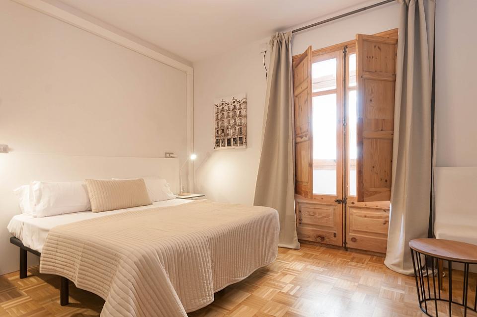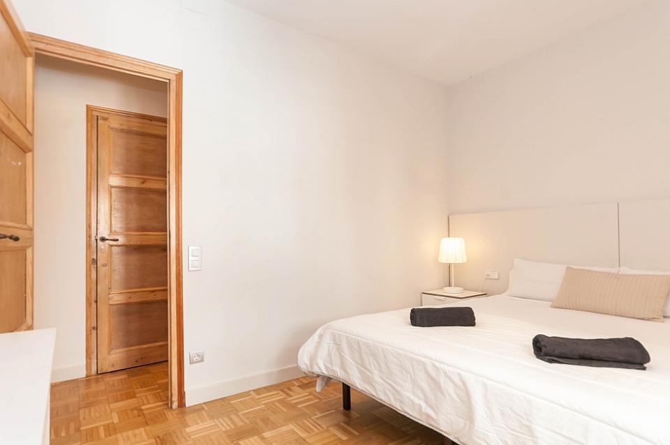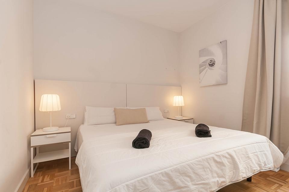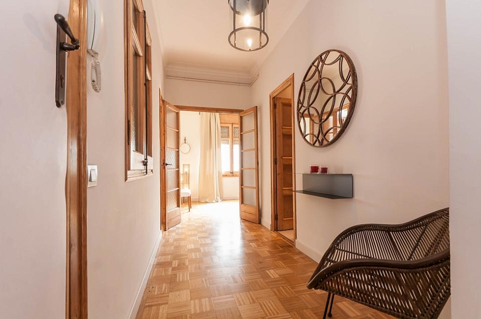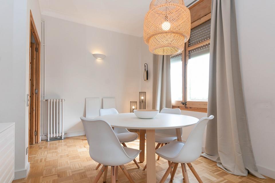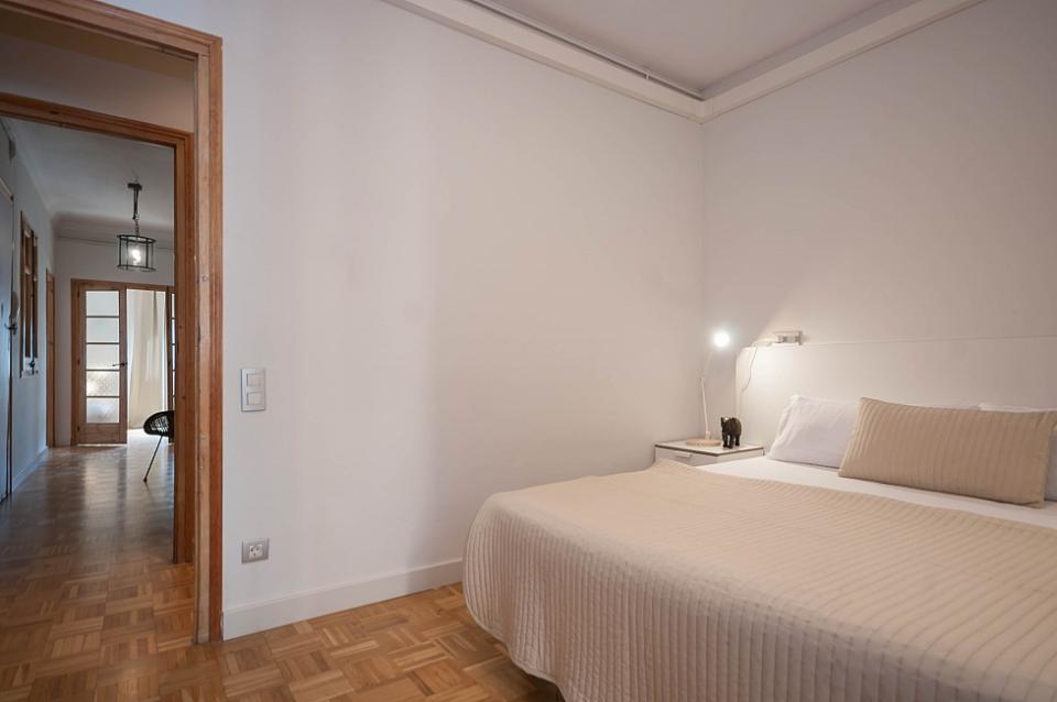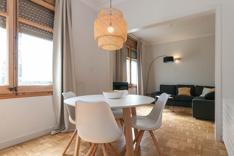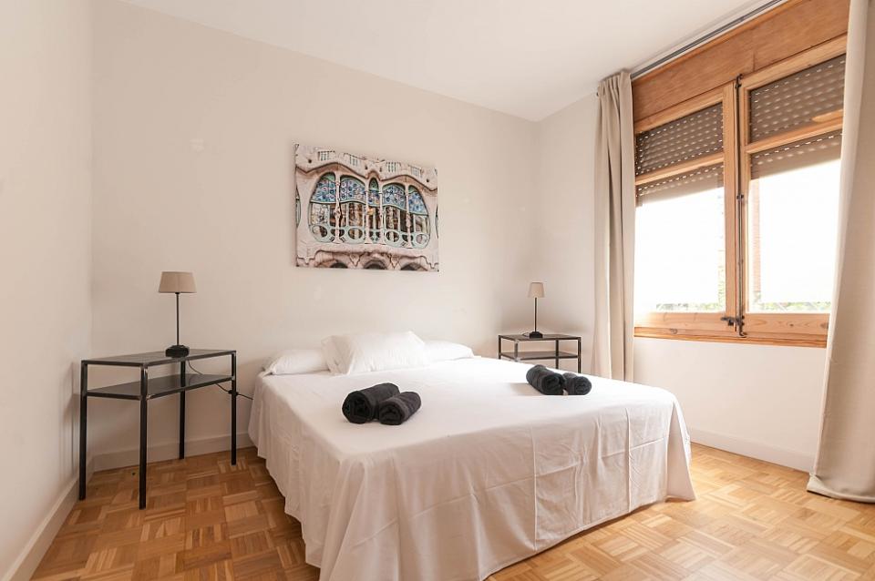Exquisito apartamento de vacaciones disponible para grupos en un tranquilo barrio residencial cerca de la Sagrada Familia de Gaudí. El interior cuenta con una decoración sencilla y sofisticada, dominada por una limpia combinación de colores blanco y beige y unas hermosas puertas, suelos y acabados hechos de madera clara. Las enormes ventanas, adornadas con los mismos preciosos marcos de madera y clásicas cortinas de color beige, proporcionan mucha luz durante el día. En la sala de estar se encuentra una elegante lámpara en forma de arco y un acogedor sofá cantonero negro y, más adelante, un hermoso espacio de comedor con una mesa circular blanca. Las habitaciones presentan una decoración minimalista con imágenes de las obras maestras arquitectónicas de Gaudí, y están suavemente iluminadas por lámparas de lectura a cada lado de las cómodas camas. La vivienda cuenta con 2 baños con ducha y una fantástica cocina en forma de U, con todos los accesorios que necesitarás para cocinar en casa.