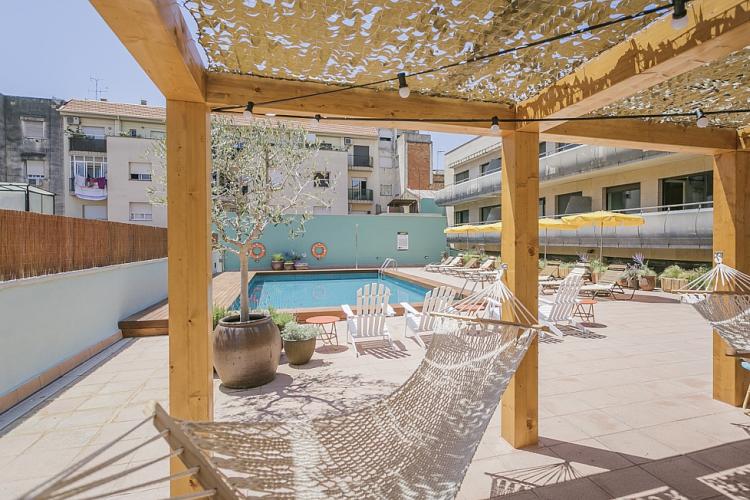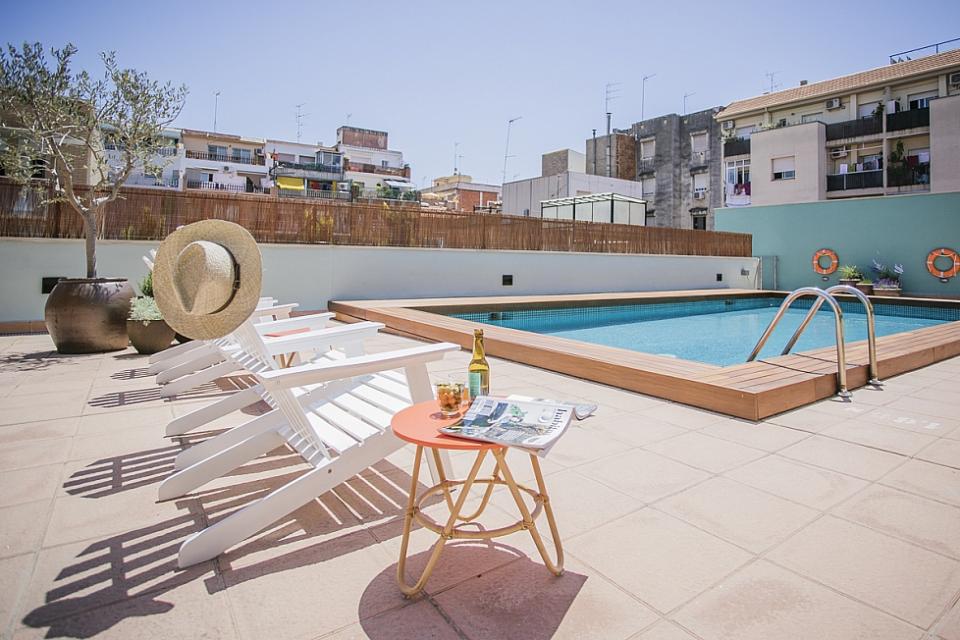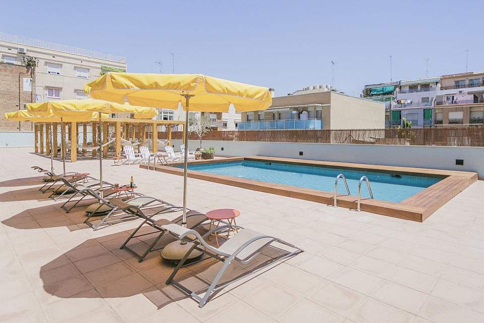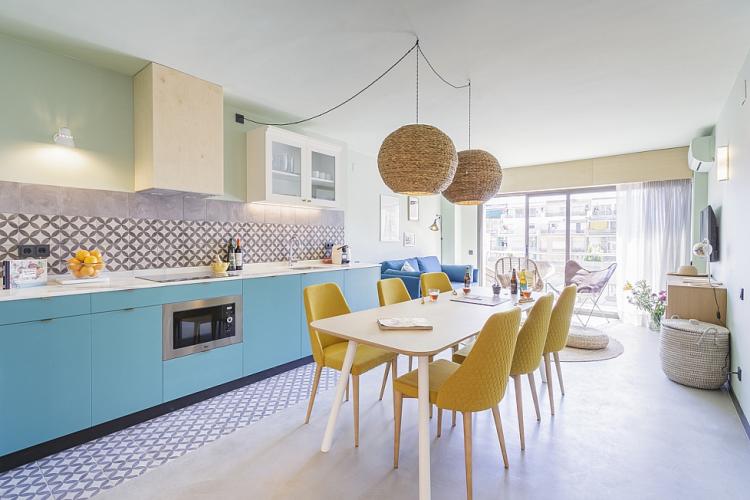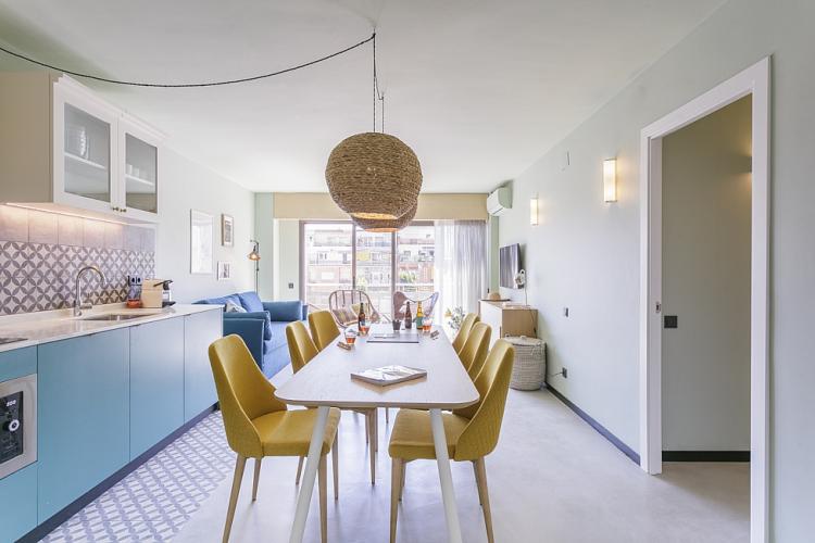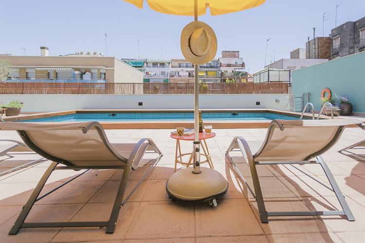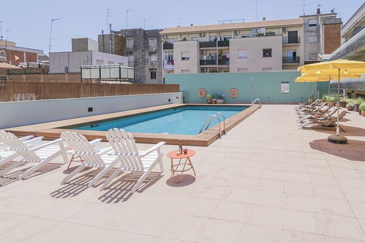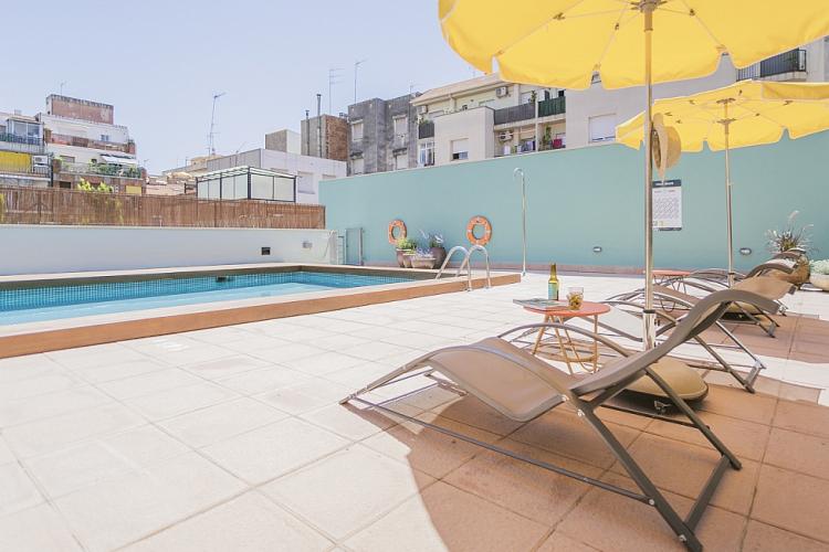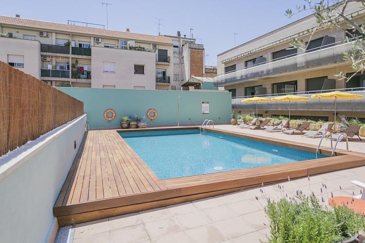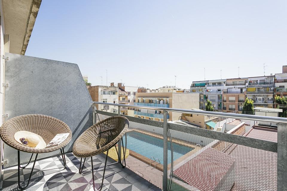 Amplio, luminoso y equipado apartamento con una piscina comunitaria - este moderno apartamento presenta todo lo que una familia podría necesitar durante una estancia de relax en Barcelona. Pasarás un tiempo fantástico en la zona al aire libre, bañándote en la piscina y relajándote en la terraza que la rodea. El interior cuenta con una hermosa sala de estar con sofás rojos y azules y mesas blancas, creando un gran ambiente para relajarte con una película y pasar tiempo con tus seres queridos. Cerca se encuentra una hermosa mesa de madera, justo al lado de una cocina moderna con acabados de alta calidad hechos de madera clara, baldosas blancas y mármol. El apartamento cuenta con un sofisticado dormitorio principal, con un elegante cabecero de madera y un gran armario, así como otra habitación decorada con relajantes tonos en blanco y crema para hacerte sentir confortable. Las habitaciones cuentan con acceso a un balcón soleado, donde podrás respirar un soplo de aire fresco. El apartamento dispone de un baño impecable con azulejos brillantes y una bañera.