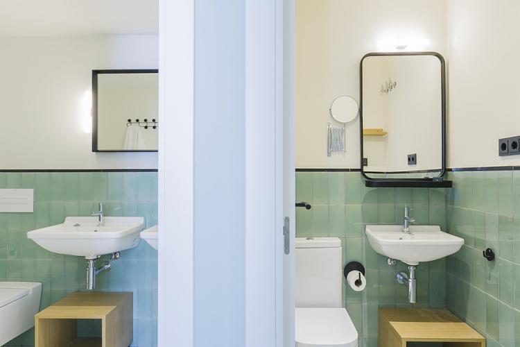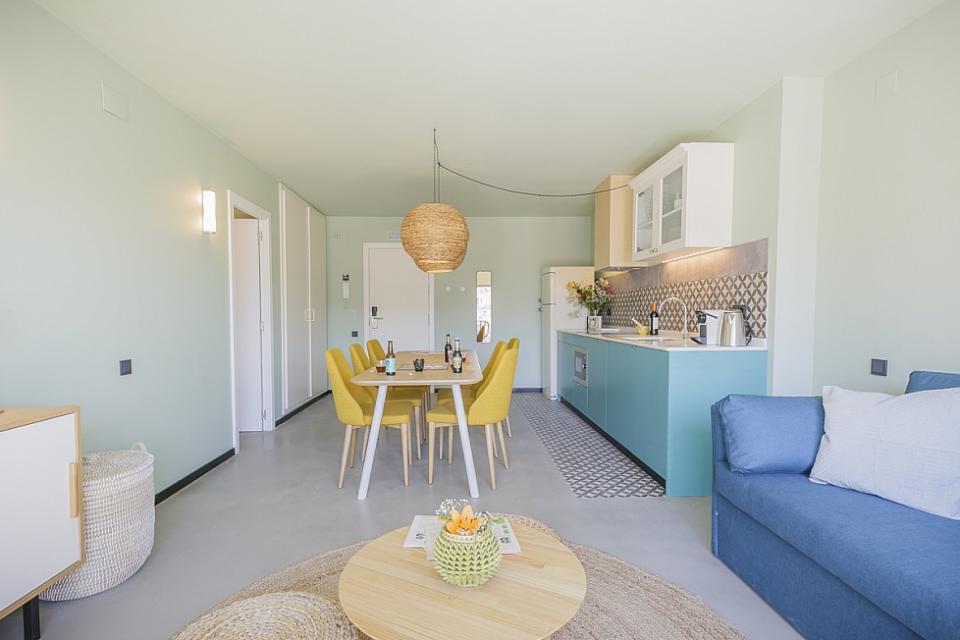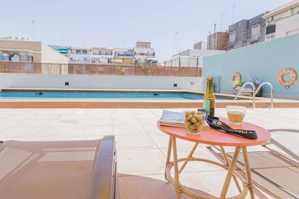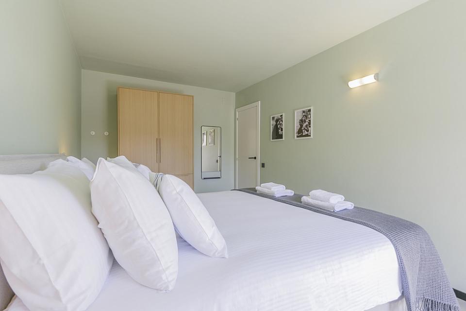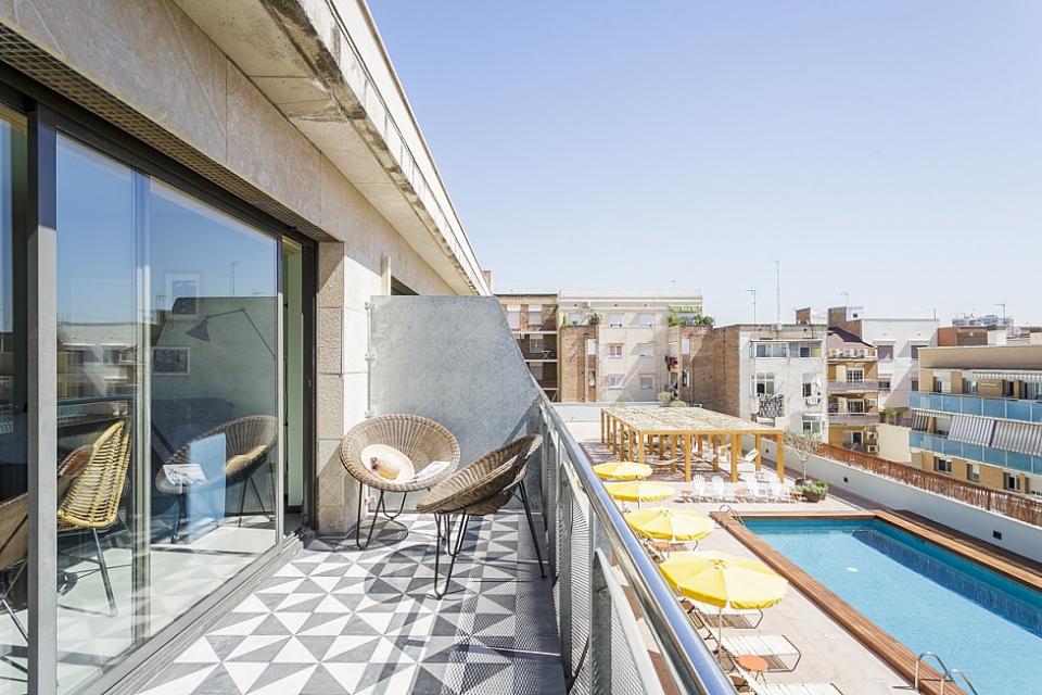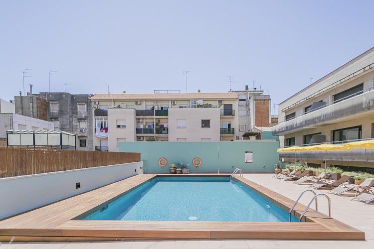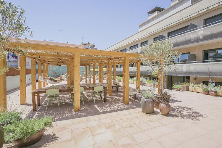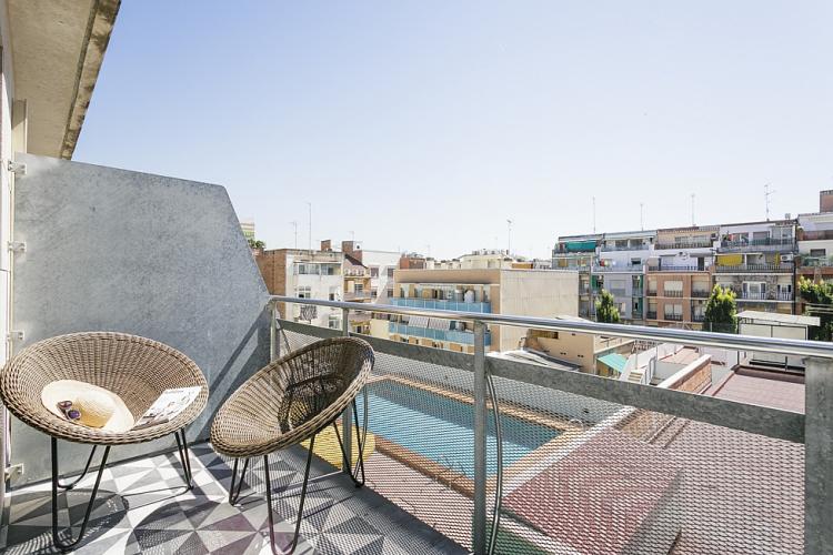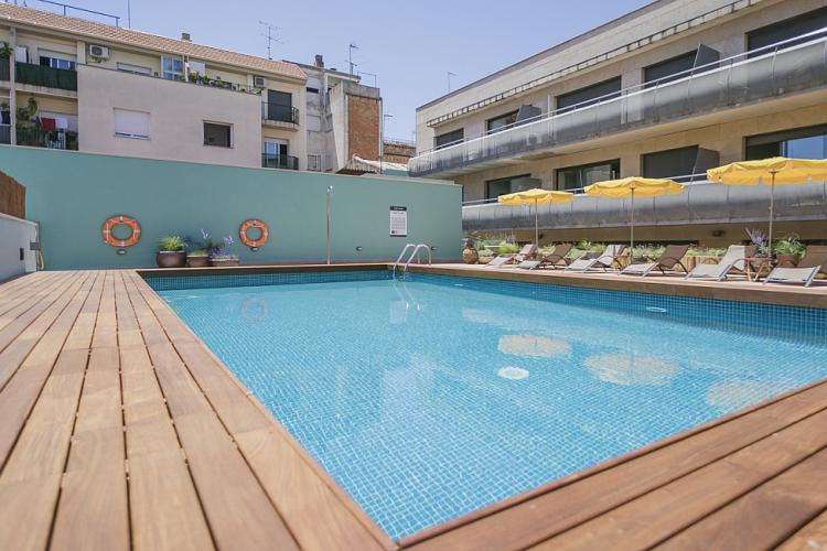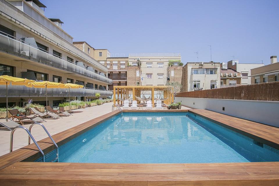 Amplio, luminoso y equipado apartamento con una piscina comunitaria - este moderno apartamento presenta todo lo que una familia podría necesitar durante una estancia de relax en Barcelona. Pasarás un tiempo fantástico en la zona al aire libre, bañándote en la piscina y relajándote en la terraza que la rodea. El interior cuenta con una hermosa sala de estar con sofás rojos y azules y mesas blancas, creando un gran ambiente para relajarte con una película y pasar tiempo con tus seres queridos. Cerca se encuentra una hermosa mesa de madera, justo al lado de una cocina moderna con acabados de alta calidad hechos de madera clara, baldosas blancas y mármol. El apartamento cuenta con un sofisticado dormitorio principal, con un elegante cabecero de madera y un gran armario, así como otra habitación decorada con relajantes tonos en blanco y crema para hacerte sentir confortable. Las habitaciones cuentan con acceso a un balcón soleado, donde podrás respirar un soplo de aire fresco. El apartamento dispone de un baño impecable con azulejos brillantes y una bañera.