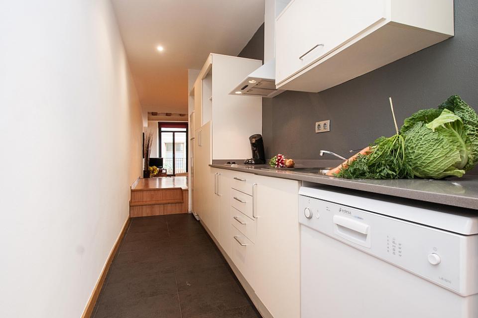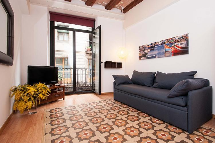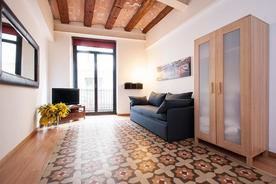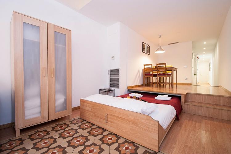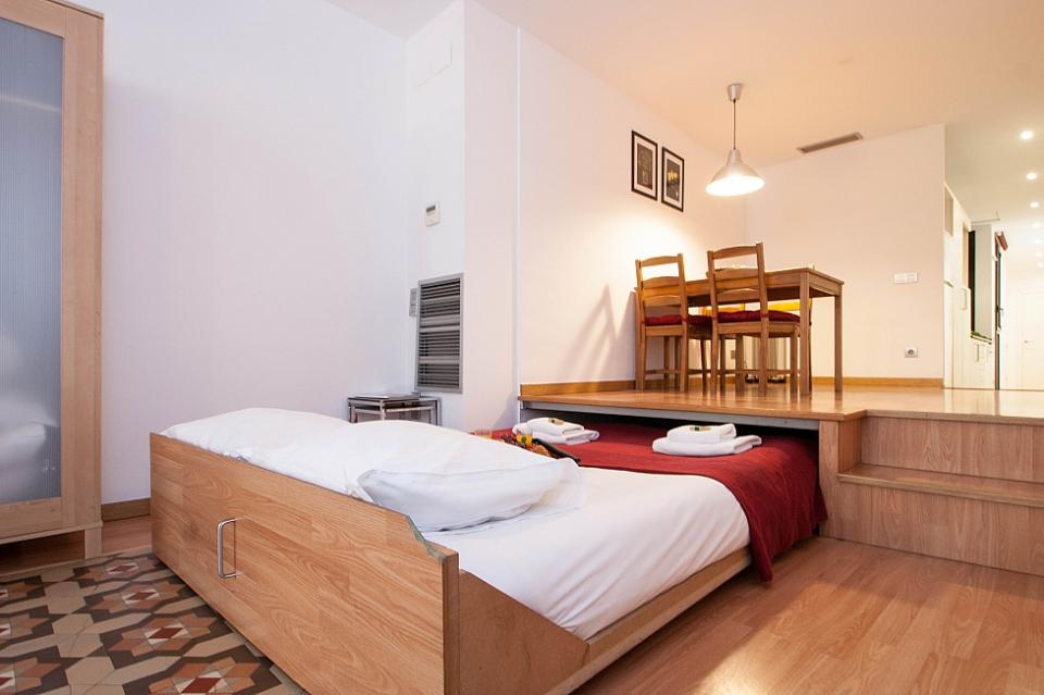 Precioso estudio cuya decoración ha sido realizada teniendo en cuenta el modernismo catalán, ejemplificado en su suelo en mosaico y preservando la estructura original de la vivienda reflejada en las vigas de madera en el techo. La zona de estar dispone de mucha luminosidad gracias a su salida exterior, asímismo cuenta con una magnífica cama retráctil que maximiza el espacio. Si buscas un alojamiento elegante y singular en tu viaje a Barcelona, este sin lugar a dudas el alojamiento perfecto.