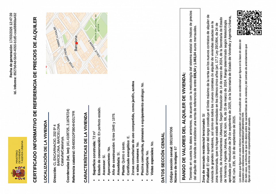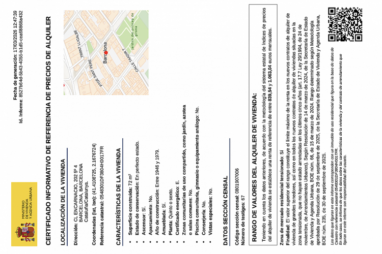 Según la legislación actual en Catalunya, publicamos esta habitación para alquiler temporal. Hay un total de 3 habitaciones en la vivienda. (mínimo 32 noches y máximo 330 noches) indicando su NRA: ESHFNT00000805800021462200100000000000000000000000005; el precio en el Índice del Ministerio (desde 839 € al mes hasta 1063 € al mes el piso entero). Ref. catastral: 0548301DF3804H0017FR. Cédula de habitabilidad adjunta y certificado energético también. El motivo del alquiler debe estar debidamente justificado con la documentación pertinente. Zona tensionada: sí. Última renta: no se ha alquilado por la LAU ni de forma anual ni como residencia habitual. Gran tenedor: no. Depósito a consultar.