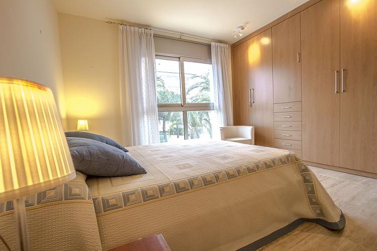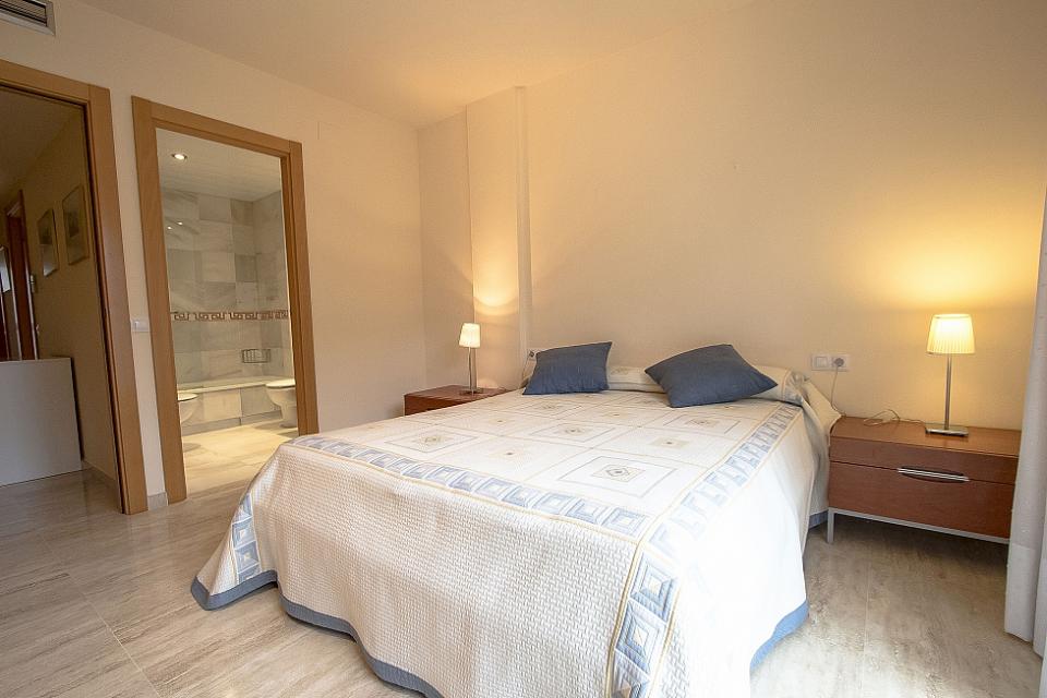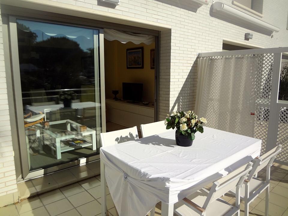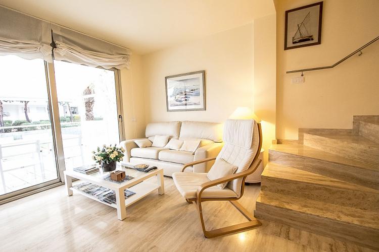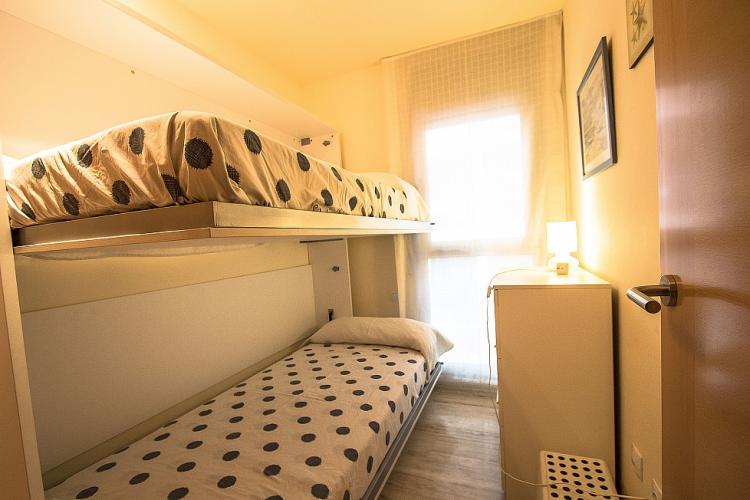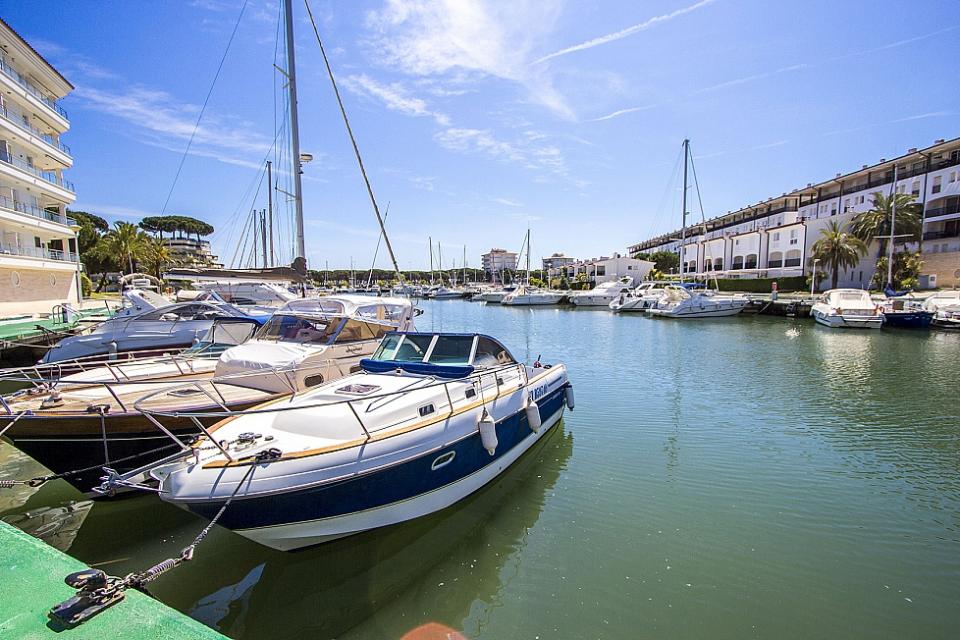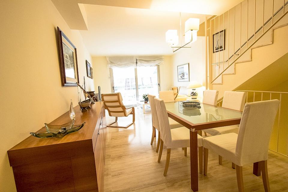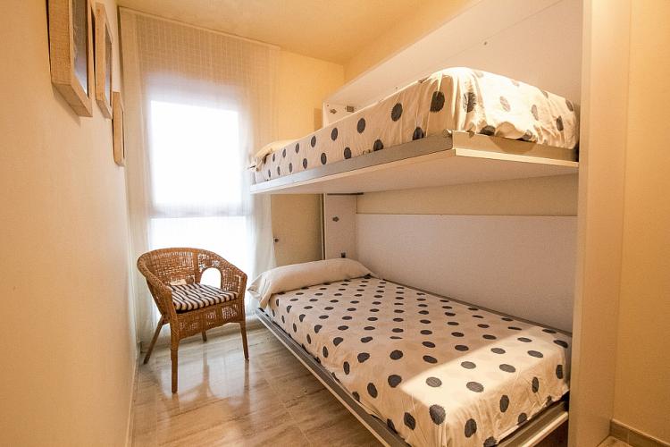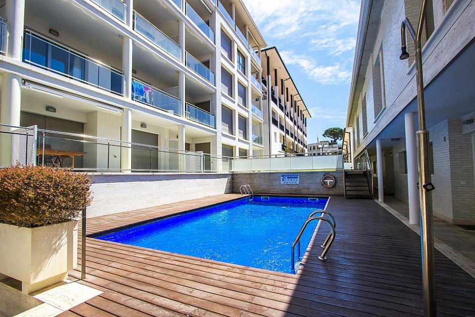 Fantástico y moderno apartamento con acceso a una piscina comunitaria, en la cual podrás tumbarte y broncearte, ubicado en Platja d'Aro. En la planta baja se encuentra una preciosa sala de estar con un diseño fresco y de muy buen gusto, suelo de parqué y decoraciones náuticas en la pared. La sala está dividida en un comedor con una mesa de madera y cristal para 6, y un area con un sofá frente a una mesita de café y TV. En el otro lado del comedor se halla la cocina, equipada con elegantes encimeras negras y todos los accesorios necesarios. Desde el salón se accede a una soleada terraza con una mesa y vistas a un puerto cercano. El apartamento cuenta con 2 habitaciones con literas, y un amplio dormitorio principal con un enorme armario de madera, acceso a un baño privado con bañera y preciosas vistas de las palmeras que rodean la propiedad.