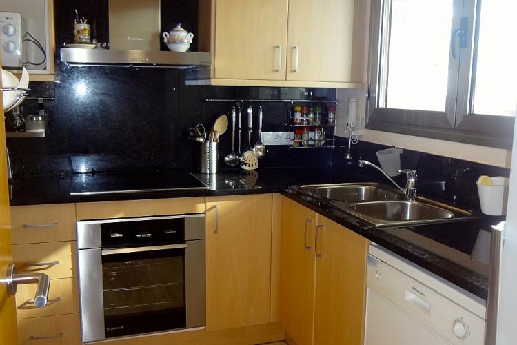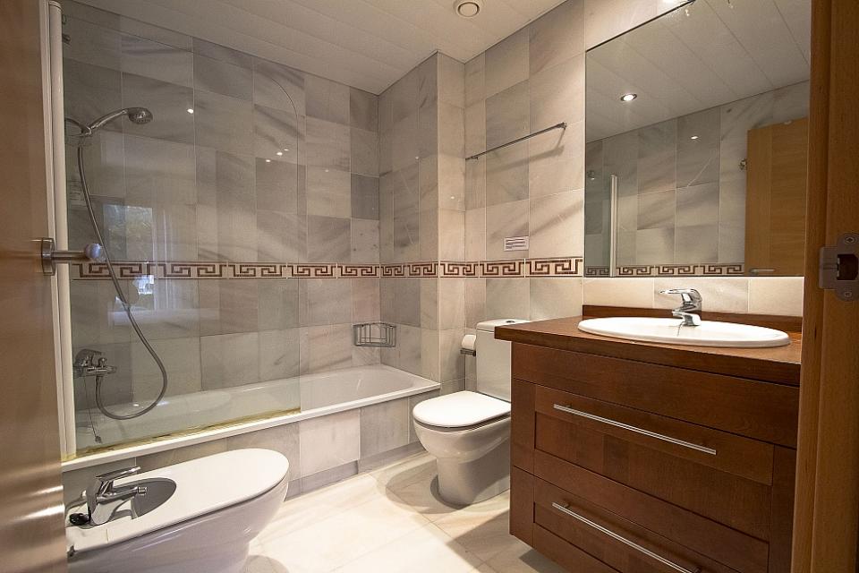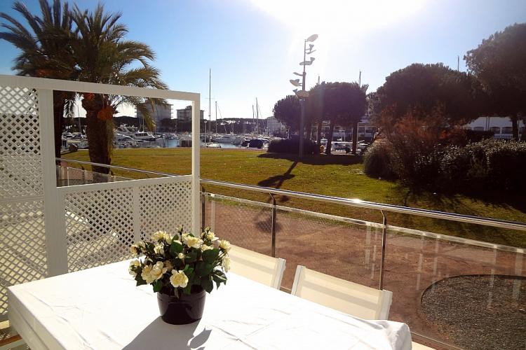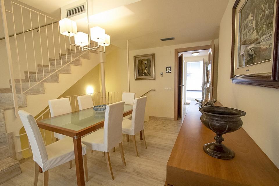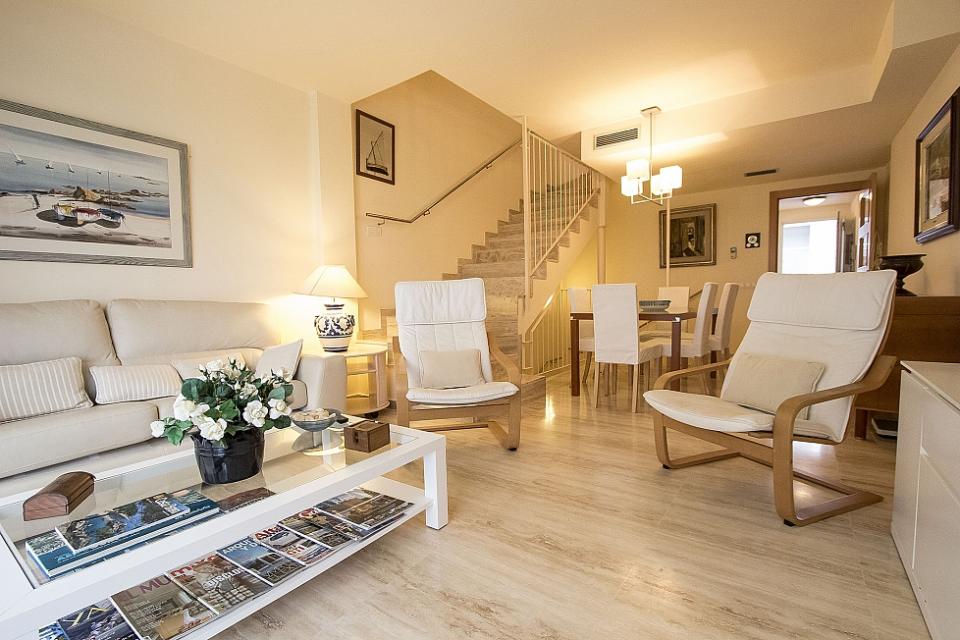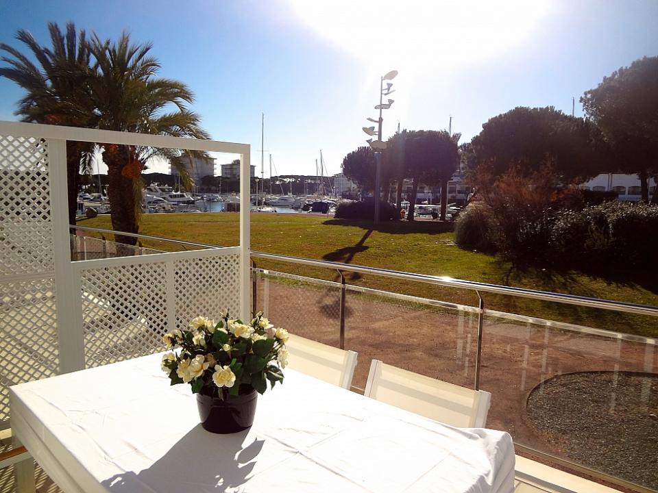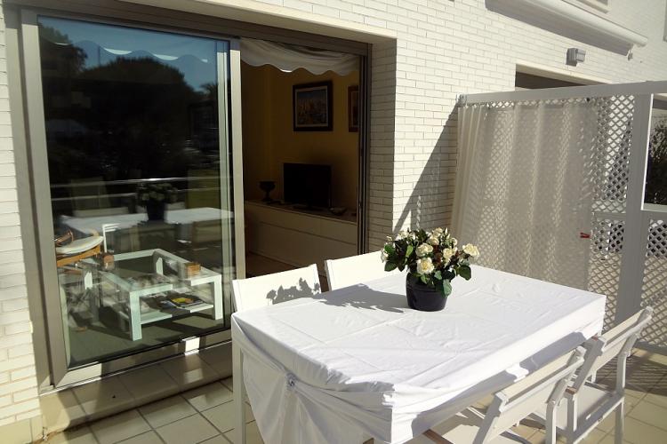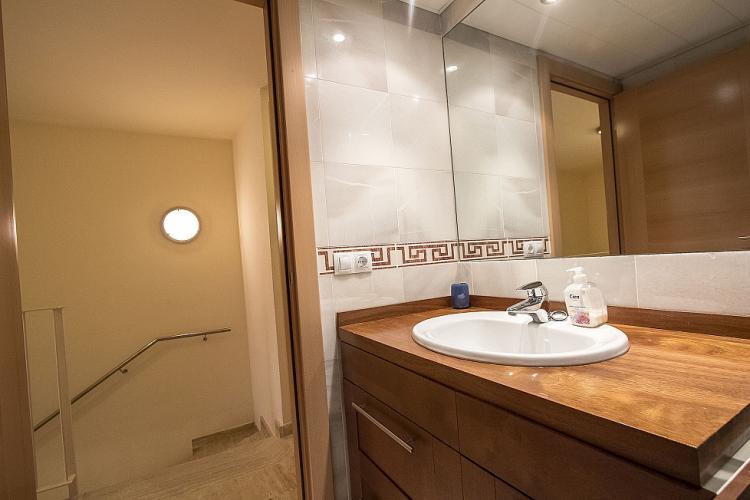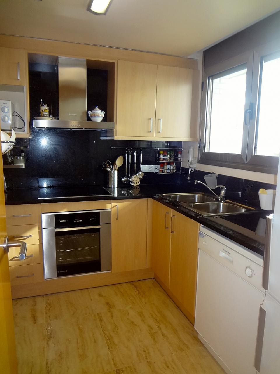 Fantástico y moderno apartamento con acceso a una piscina comunitaria, en la cual podrás tumbarte y broncearte, ubicado en Platja d'Aro. En la planta baja se encuentra una preciosa sala de estar con un diseño fresco y de muy buen gusto, suelo de parqué y decoraciones náuticas en la pared. La sala está dividida en un comedor con una mesa de madera y cristal para 6, y un area con un sofá frente a una mesita de café y TV. En el otro lado del comedor se halla la cocina, equipada con elegantes encimeras negras y todos los accesorios necesarios. Desde el salón se accede a una soleada terraza con una mesa y vistas a un puerto cercano. El apartamento cuenta con 2 habitaciones con literas, y un amplio dormitorio principal con un enorme armario de madera, acceso a un baño privado con bañera y preciosas vistas de las palmeras que rodean la propiedad.