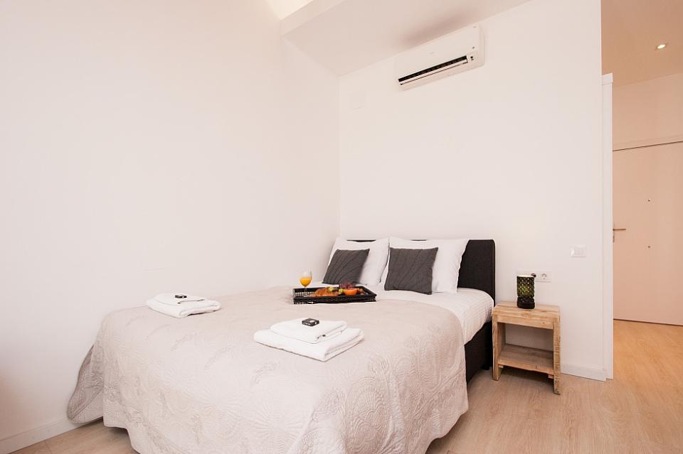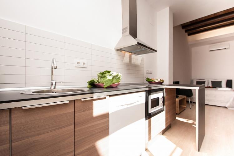 Studio di Precious ispirato allo stile scandinavo, in cui caratteristica principale è l'arredamento in legno e semplici elementi. Il pavimento in legno si sposa perfettamente con il tocco modernista catalano del piano, illustrato nel pavimento di piastrelle di cemento in soggiorno, e le pareti bianche offrono luminosità e freschezza al tutto. Questo è il luogo ideale per una persona o una coppia che desiderano essere ospitati in un luogo accogliente, dotato di tutto per avere un ottimo momento a Barcellona.