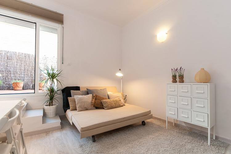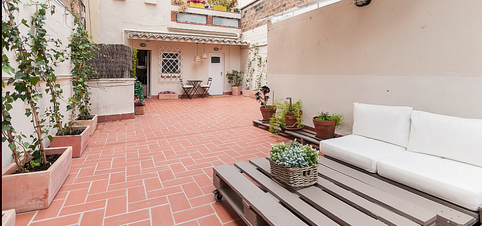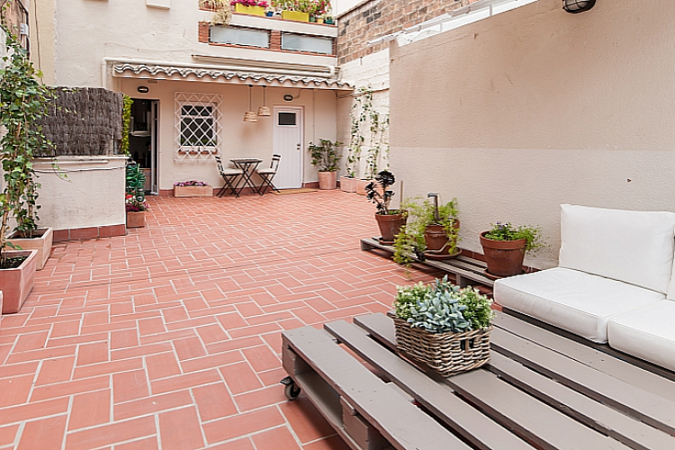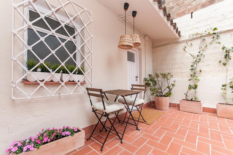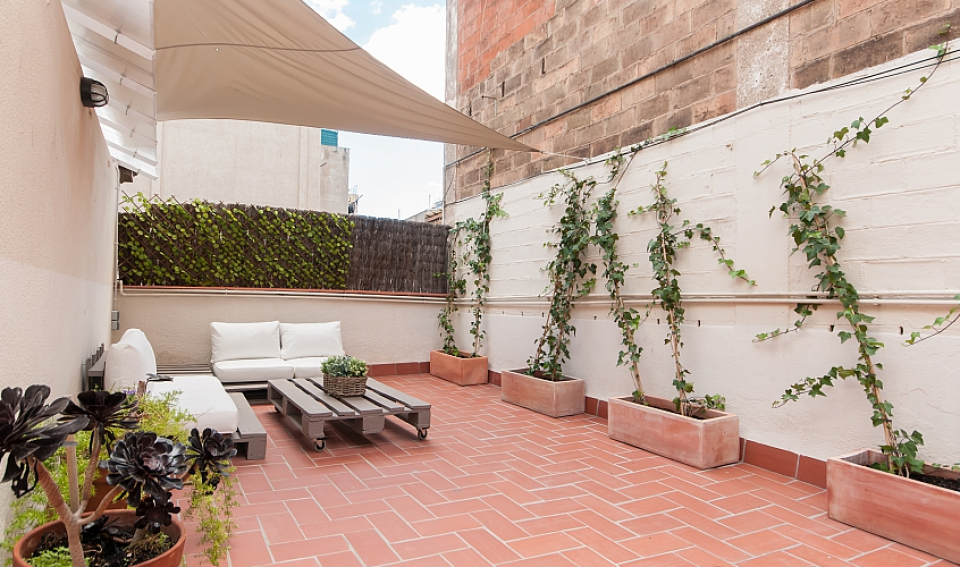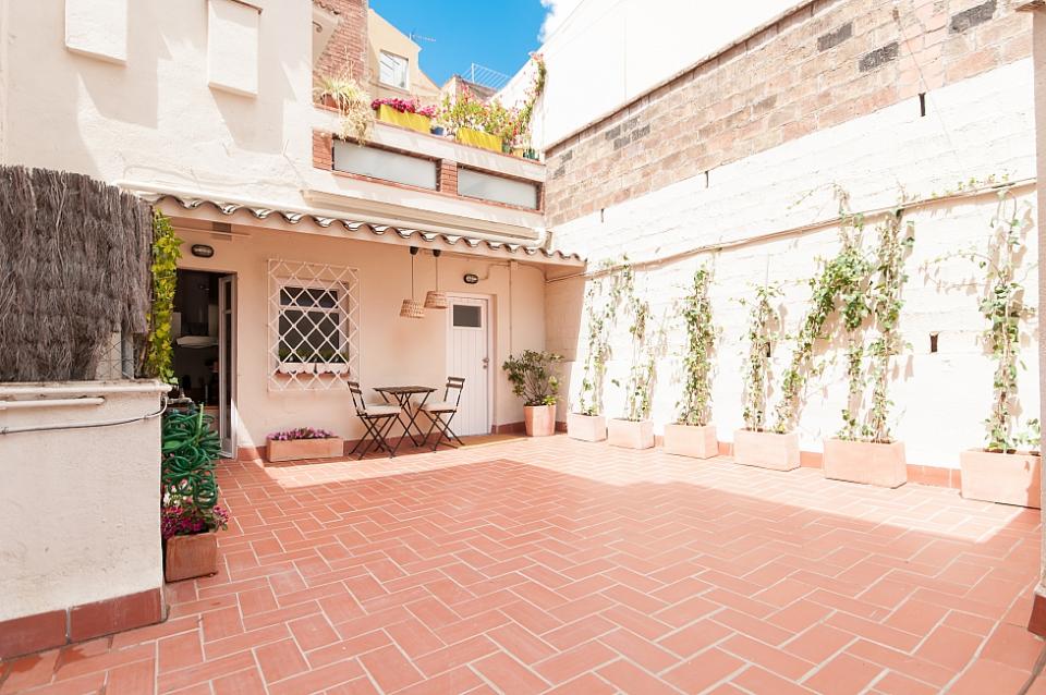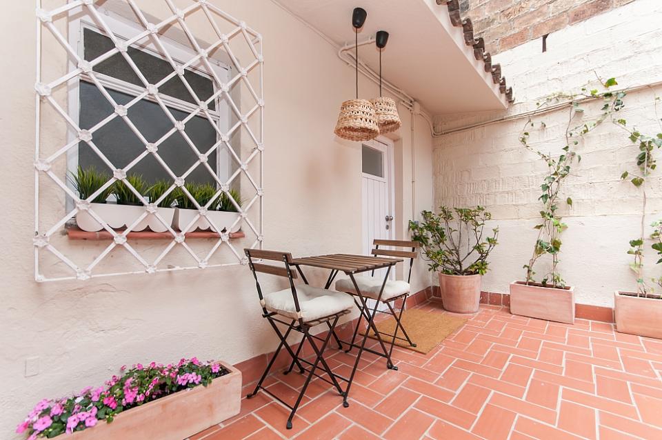 Nydelig leilighet med 2 terrasser tilgjengelig for en langvarig opphold i Barcelona, ​​perfekt for et par eller 2 venner til å dele. Interiøret har en frisk, Middelhavet føler med glatte parkettgulv og en samling av friske potteplanter spredt over hele plassen. Nær minimal innredet soverom, innredet med 2 koselige enkeltsenger, vil du finne et rent bad, komplett med en dusj og stort rundt speil over vasken. Boligen har også en sjarmerende kjøkken med egen liten spisestue nook og tilgang til en annen terrasse. En gang fører til vennlig stue, komplett med en koselig beige sofaen og myk shag rug, samt en spisestue med en hvit tabellen for 3. Stuen har utgang til solrik terrasse med varme terrakottafliser, og flere grønne planter gir en naturlig atmosfære. Terrassen har en overbygd stue plass med koselige solarium som å slappe av med en god bok, og en verdifull spiseplass, perfekt for middag med din kjære under stjernene.