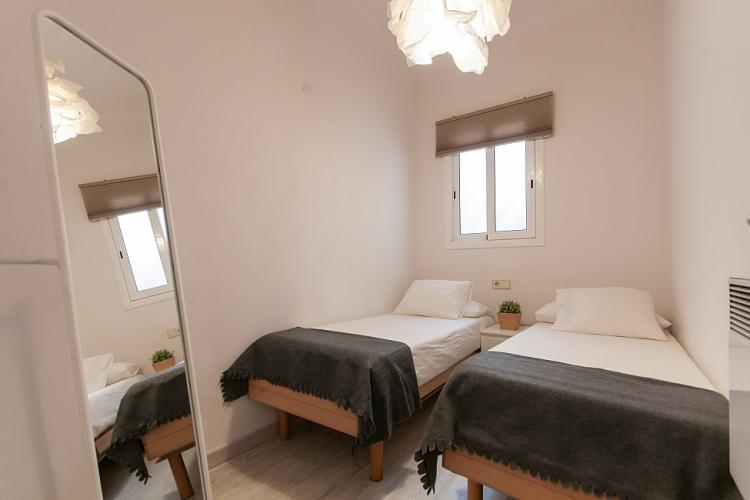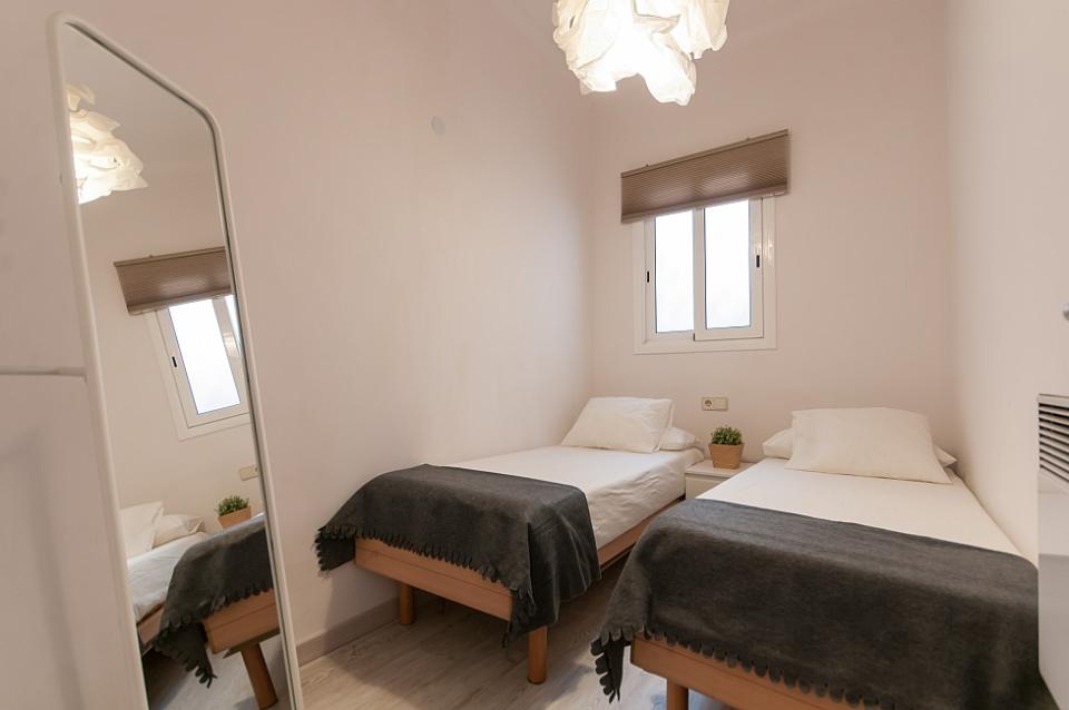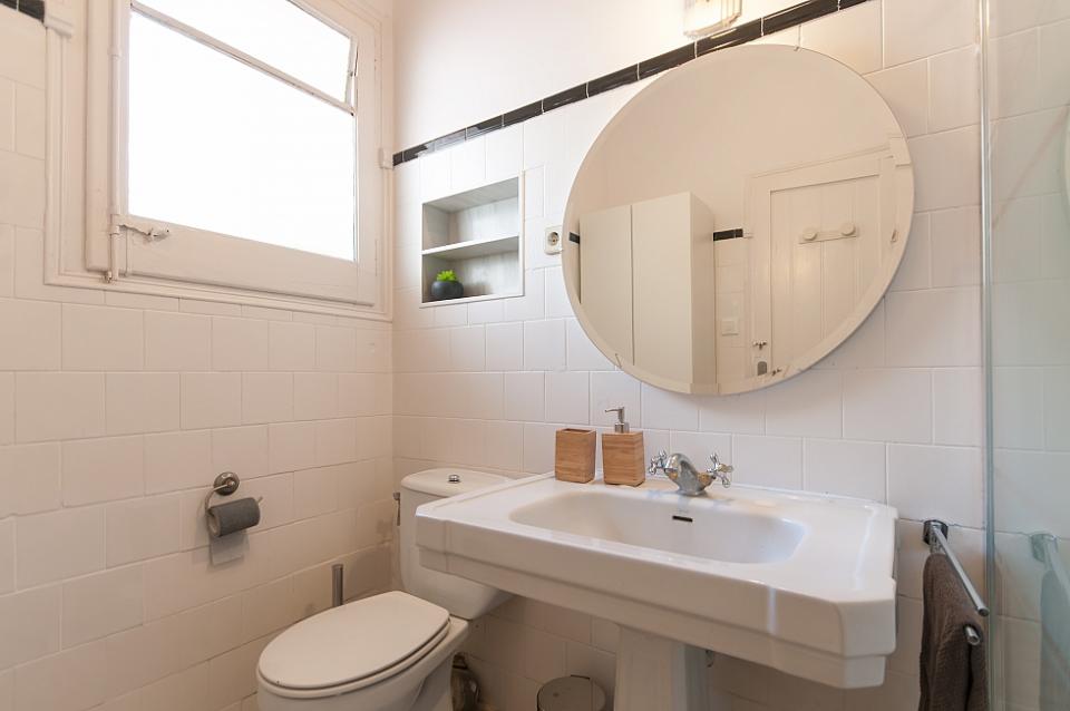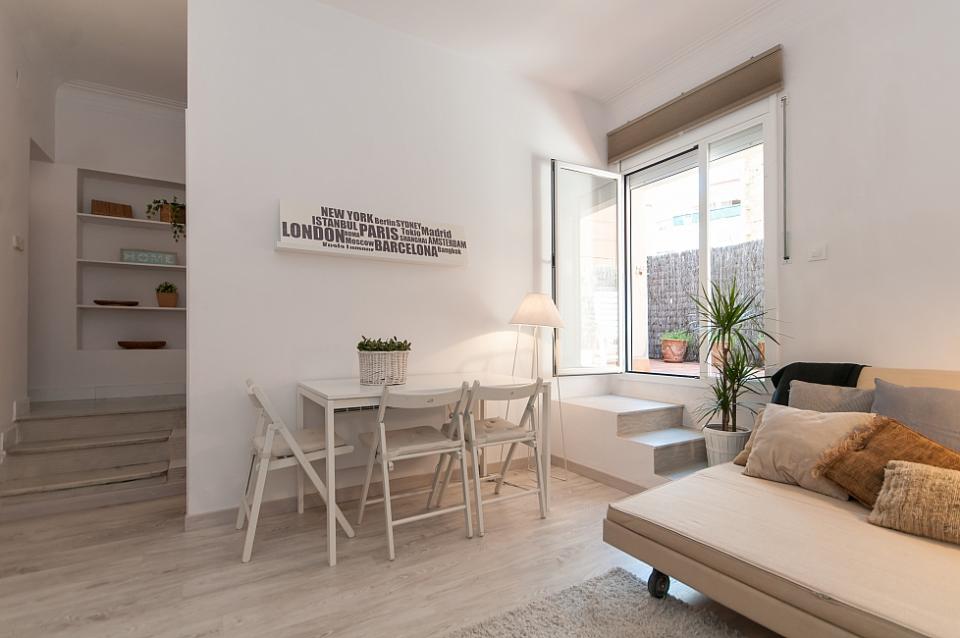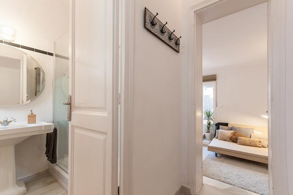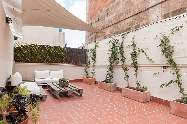 Nydelig leilighet med 2 terrasser tilgjengelig for en langvarig opphold i Barcelona, ​​perfekt for et par eller 2 venner til å dele. Interiøret har en frisk, Middelhavet føler med glatte parkettgulv og en samling av friske potteplanter spredt over hele plassen. Nær minimal innredet soverom, innredet med 2 koselige enkeltsenger, vil du finne et rent bad, komplett med en dusj og stort rundt speil over vasken. Boligen har også en sjarmerende kjøkken med egen liten spisestue nook og tilgang til en annen terrasse. En gang fører til vennlig stue, komplett med en koselig beige sofaen og myk shag rug, samt en spisestue med en hvit tabellen for 3. Stuen har utgang til solrik terrasse med varme terrakottafliser, og flere grønne planter gir en naturlig atmosfære. Terrassen har en overbygd stue plass med koselige solarium som å slappe av med en god bok, og en verdifull spiseplass, perfekt for middag med din kjære under stjernene.